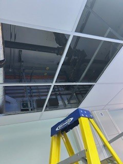 Damp patches were noticed in ceiling tiles above a busy corridor in the hospital. A maintenance worker climbed a ladder, removed the tiles and accessed the roof space to investigate.