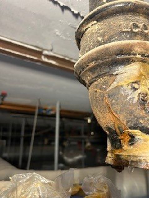 The worker found a hairline crack across the U-bend, located directly above the Y-joint. Wastewater was seeping through, corroding the three pipes which met at the Y-joint and dripping further down to damage and discolour the ceiling tiles.